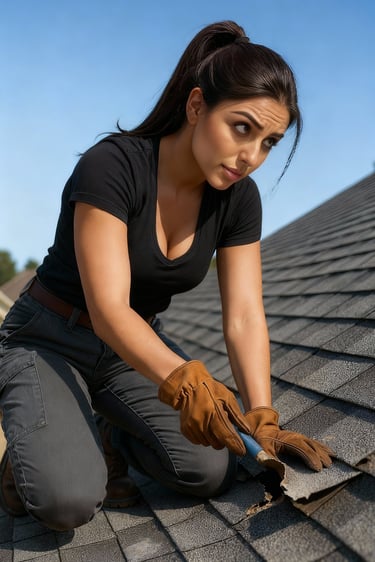Ember on ladder clearing leaves from house rain gutter.